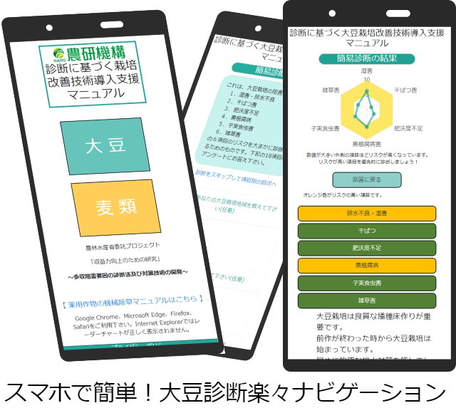| ★ | スマホで簡単!ダイズ診断 楽々ナビゲーション ─診断に基づくダイズ栽培改善技術導入支援マニュアルの紹介─(PDF) ![]() |