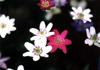 | ミスミソウは、本種の中で本州中部以西に自生する亜種です。ミスミソウは、自生のものでも花の変異に富み、播種すると様々な色、形の花が咲き、興味が尽きない花です。最近、イギリスのフラワーショーでも日本のミスミソウが展示され、大変な人気でした。 |
