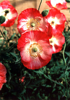 ロアエス| ヨーロッパ中部に自生しているポピーで、英語ではcorn poppy又はfield poppyなどと呼ばれています。 花は、紅、紅紫、ピンクなど多様で、基部に黒色の斑点が入ることがあります。花が美しいため、シャレー・ポピー、ダッチ・ポピーなどの様々な園芸品種が作り出されています。 シャレー・ポピーは、イギリスのコーンウォール州シャーレで1880年頃に育成されたものです。庭園用としては美しいのですが、イギリスなどでは、 小麦畑の雑草として農家には頭痛の種で、「redweed(赤い雑草)」や「headache(頭痛)」と呼ばれています。 日本人の私には、小麦畑の真っ赤なポピーはまさに絵になる風景なんですが。 |