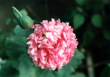 | 八重の品種で花弁が巻縮する品種を「カーネーション咲き」といいます。八重ですが雄しべも雌しべもあるので刮ハができます。 |