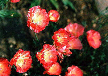 カリフォルニカ`バレリーナ’| E.californiaから作られた品種は黄色の他、白、赤色もあり、八重咲きもあります。 写真は、半八重咲きの品種ですが、同じ属の品種かと思うようなボリュームですね。 |