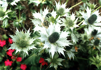 コーカサス地域、イランの原産で、高さが100〜150cmになる二年草です。これは、総苞が青ではなく銀色になる種です。
