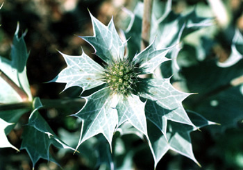 ヨーロッパ原産で、高さが40〜60cmになる多年草です。英名は、灰色がかった緑色のヒイラギのような総苞があるのでsea hollyと付けられています。