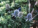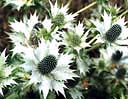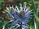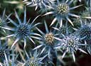 ★ プロフィール ★ アザミに似た形をしていますが、エリンギウムは、全世界的に230種も分布しているセリ科の多年草(一部二年草)です。 青色で羽状の花弁のように見える部分は、エリンギウムの特徴である総苞(そうほう)です。本当の花は中心の円柱状の部分で、小さな花のあつまりが頭状花序を形成します。花序、総苞、種によっては茎・葉までも青や銀色の金属的な光沢のある色になるのも本属の特徴です。部分的に金属光沢のある植物は、本属の他にはポプラ、ヤナギ、リュウカデンドロン、ユーカリ、ルリタマアザミなどがあります。しかし、全体に青や銀色の金属光沢を放つのは、他にはルリタマアザミだけでです。このような植物の葉の金属光沢は、葉表面の細かい毛や鱗片、表面の細胞の下の空間、またはろう質が光を反射するために現れるもので、高山や乾燥地帯に適応するために進化したものだとされています。この金属光沢は、植物の若い時期には現れません。 これらの特徴的な花序や総苞などは、銀色、白色、紫色などの種があり、金属光沢を持つものが多く、夏の花壇ではフォーカル・ポイントとして輝いています。 本属の総苞の形は、種毎に個性的で、羽状の種、柊の葉のような形の種、被針形の種などがあります。しかし、美しいものに刺があるのは、バラだけではないようで、本属は葉・総苞に刺のある種が多いのです。 本属は、冷涼で乾燥した地域に適しているので、イギリスと異なり日本での栽培地域は限定されますが、最近、切花で数種が流通しはじめたので、日本でも見られるようになりました。切花として観賞した後は、ドライフラワーにもなります。 |
