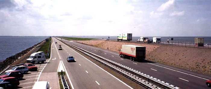 オランダの命綱の大堤防(道路左が湖、右が海)