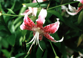 | 高さが100〜150cmになり、九州、四国、台湾、中国の一部に自生しています。シーボルトが日本産のユリとしてヨーロッパに紹介し、 当時ルビーのように美しいユリとして大変評判になったそうです。その後、オランダでは、日本のカノコユリ、ヤマユリ、 タモトユリなどを交配して様々な品種が育成されました。そして、100年かけて「カサブランカ」などのオリエンタル・ハイブリッドが作り出され、 世界中のブームとなりました。 |