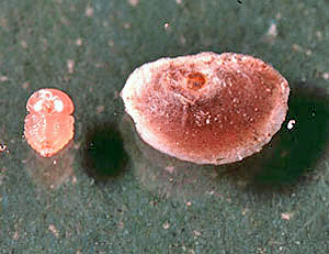 寄主植物:エニシダ、カキ、カシ類、ナシ、カンキツ類、カラタチ、ツバキ、チャ、ヒイラギモクセイ、ヒサカキ、ヤマモモなど多食性。 介殻の殻点(へそ)が中心にないのが特徴。成虫の介殻は約3mmで、介殻の下の虫体はうす紫ではっきりした縊れがある。成虫越冬で、枝や幹に多い。年2回発生。 |