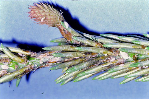 寄主植物:アカマツ、クロマツ、ゴヨウマツ。 幼虫越冬。5月に成虫になり体長は3〜4mm、6月頃に産卵するが、卵のうは作らず、産卵された卵はすぐに孵化する。孵化幼虫は針葉に集合する。 年1回の発生だが、暖地では2,3回発生もあるとか。 |