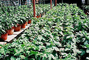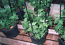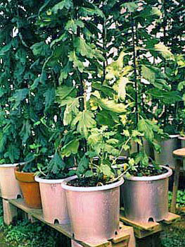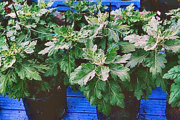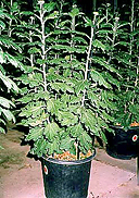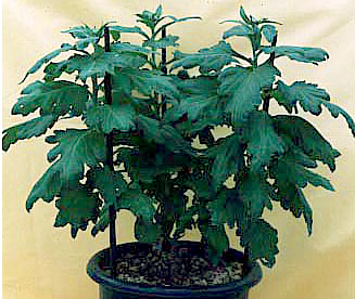 ■ダルマ作り三本仕立てより一ヶ月遅く挿し芽して7号鉢に定植し、Bナイン(矮化剤)を使って草丈を60p以内に仕立てる小型の三本仕立てで、 全体が丸っこくダルマのような形なのでこの名がつきました。鉢が軽く場所をとらない、乗用車で運べる、などの利点があるため人気があります。 |