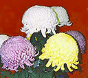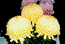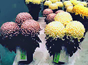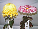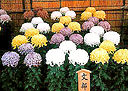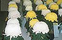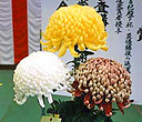 ■三本仕立て盆養とも言い、大菊の最も基本的な仕立て方です。1本の苗を摘芯して3本の枝を伸ばし、後の1輪を花の2/3位高く、前の2輪は同じ高さに、三つの花を同時に、 同じ大きさに揃えて、出来るだけ巨大輪に咲かせ、茎・葉を含めた全体が調和を保つように育てます。12鉢花壇は、一人の作者が赤白黄各4鉢、12種類の鉢を同色が斜めに並ぶように配置展示するもので、大阪附近から西の地方で盛んです。 花の大きさを揃え、各位置ごとに予定どおりの高さに育てるには高度の技術が必要です。関東地方などでは、1鉢の優秀を競うのが主体です。 |