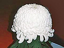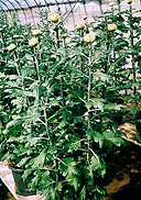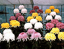 ■千輪作り1本の苗を何回も摘芯をくり返して枝数をふやし、半球形になるように花を並べて咲かせる仕立て方です。前年の秋に挿し芽した苗から出た冬至芽を育てて一年かけて300輪咲かせるのが普通ですが、二本松市の斉藤弘さんは7人の仲間と研究会を作り、 2年がかりで1本の苗から確実に2,000輪以上咲かせる技術を確立しています。 |