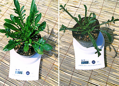 ガザニヤ苗(左のサーモゲル入り386gに対して右の普通土は258g)
