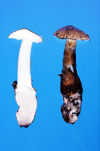 | [特 徴] 傘は初め円錐形で後には中央部のみが突出して平らにひらく。表面の色は黄褐色から褐色の繊維状鱗片におおわれる。ひだは柄に直生から湾生し、白色、並び方は密。 柄は白色で表面には暗褐色の鱗片がつき、根もとはカブラ状の塊になる。 |