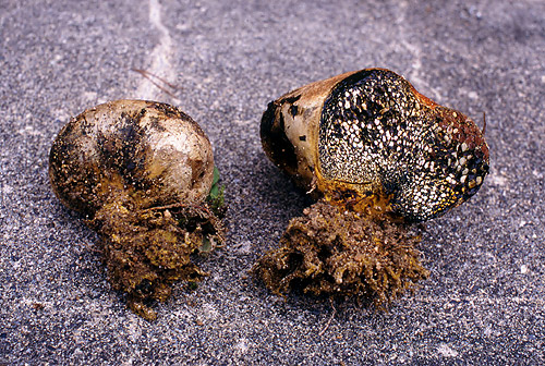 | [特 徴] きのこは類球形から洋なし型で赤褐色。成熟すると上部から粉状になってくずれる。きのこの内部は不規則な形の小粒状。 |