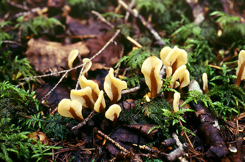| [特 徴] きのこはしゃもじ形で、淡黄色から卵黄色。柄は焦げ茶色で下部に向かって太くなる。 |