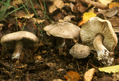 | [特 徴] 傘は初め半球形から円錐形で後にはほぼ平に開く。表面の地色はほぼ灰色で黒っぽい鱗片に密に覆われる。ひだは上生から湾生し、並び方は密、色は淡灰色。 傷つけるとごくゆっくりと赤味がかる。柄の地色は灰褐色で黒っぽい鱗片に覆われる。 |
