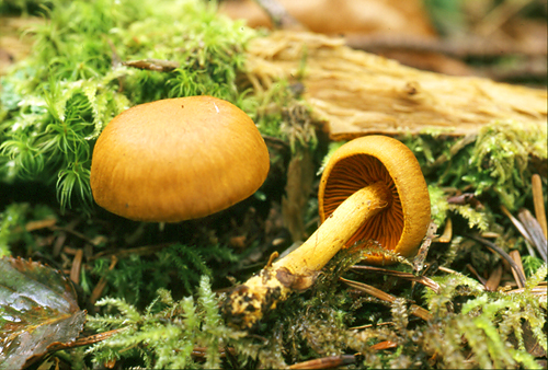 | [特 徴] 傘は初めまんじゅう形で、後には平に開くが中央部はやや盛り上がる。表面の色は橙黄褐色から茶褐色で絹糸状になる。ひだは上生からやや湾生し、並び方は密。 色は初め血赤色で後には赤褐色になる。柄は傘とほぼ同色で表面は繊維状。 |