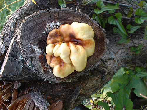 | [特 徴] きのこはこぶ状で、表面の色は初めレモン色、後には褐色になる。注意して観察するときのこの下面に管孔状の部分が形成されることもあるが、 大部分は不完全なままに終わる。きのこが古くなると内部が粉状になってしまう。 |