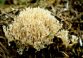 | [特 徴] きのこはいわゆるホウキタケ型で細かく枝分かれする。色は淡黄土色で手で触ると赤褐色に変色する。見かけは弱々しいがきのこは意外にしっかりしている。 |