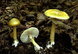 | [特 徴] 傘の色は黄色〜黄土色で中心部ほど濃色となる。ひだは白色、柄は白色〜淡黄色で濃淡の模様がある場合もある。白色のつばと白色〜淡褐色のつぼをもつ。 |