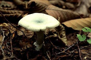さくら餅の様な香りがある。このような香りをもつ仲間にはコカブイヌシメジなどもあるが、香り自体はこのアオイヌシメジが最も強いようである。 [特 徴] 傘は初めまんじゅう形で後にはほぼ平らに開く。色は灰緑色から青緑色で、きのこが古くなると多少脱色する。ひだは初め白色で後には淡黄色や淡緑色をおびることもある。 並び方は密からやや疎で柄に直生から垂生する。柄は淡緑色で根もとは白色の綿毛状の菌糸がつく。 |