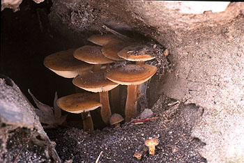 [特 徴] 傘は初め球形で後には平らに開く。色は黄褐色から茶褐色で表面にはぬめりがある。ひだは初め白色から淡クリーム色で後には淡褐色になり、 並び方はやや疎で柄に上生する。柄は黄褐色から黒褐色でビロード状の短毛におおわれる。きのこ全体に鉄サビの様なにおいがある。 |
