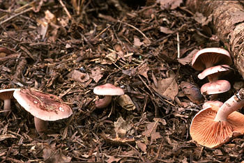 [特 徴] 傘は初め中高のまんじゅう形で後には平らに開く。表面は湿っている時はぬめりがあり色は赤褐色。ひだは淡褐色から赤褐色で柄に直生からやや垂生する。 柄は傘とほぼ同色。 |