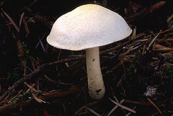[特 徴] 傘は初めまんじゅう形で後にはほぼ平らに開く。若いうちは傘の表面が黄色の点々でおおわれているが、やがてこの点々ははげ落ちて周辺部だけに残る。 ひだは白色でならびかたは疎。柄に垂生する。柄の地色は白色で表面には傘と同様の黄色の点々がついている。 |