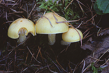 [特 徴] 傘は初め半球形からまんじゅう形で後に平らに開く。色はレモン色で中央部が橙黄色になる場合もある。表面にはぬめりがある。ひだは白色から淡黄色で並び方は疎。 柄に垂生する。柄は白色から淡黄色で不完全なクモの巣状のつばがある。表面はぬめりのある膜でおおわれている。 |