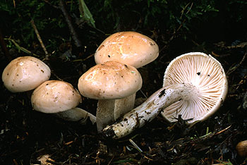 [特 徴] 傘は初め半球形で後にはまんじゅう形から平らに開く。表面にはぬめりがあり、色は淡い肌色。ひだは初め淡い肌色で後にはやや濃色になる。 並び方はややあらく柄に直生からやや垂生する。柄は淡い肌色で根もとは黄色をおびる。 |
