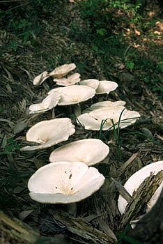 [特 徴] 傘は初めまんじゅう形で後には開いてじょうご形になる。色は白色で絹糸状の光沢があり、傘の縁の部分には放射状のスジがある。 ひだは白色で柄に直生から垂生し、並び方は密。柄はほぼ白色で内部まで充実している。 |