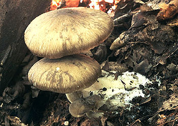 [特 徴] 傘は初め半球形で後には平らに開く。表面は灰褐色から暗褐色で虫めがねで拡大してみると細かい網目状の模様がある。ひだは白色で並び方は密。 柄にやや上生から垂生まで変化に富む。柄は傘とほぼ同色かやや淡色で根もとには剛毛状の菌糸がある。古くなるときのこ全体が黒変する。 |