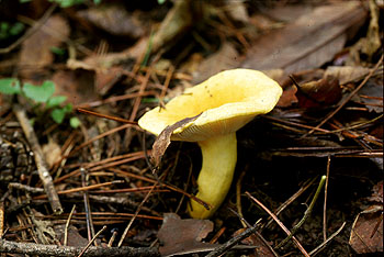 [特 徴] 傘は初めまんじゅう形で後には開いてじょうご形となる。色は鮮やかな黄色、いわゆるうこん色で表面はビロード状、ひだは白色で並び方はやや密。 柄に上生から離生する。柄はカサと同色で根もとほど色が濃くなる。 |