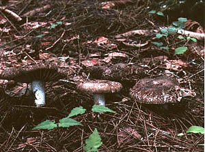 [特 徴] 傘は初め中央部がへこんだまんじゅう形で後には開いてじょうご形にそり返る。色は初め汚灰褐色や汚白色だが後にはほとんど黒変となる。 ひだは初め白色で後に黒褐色になる。並び方は疎で柄に直生する。柄は表面の色は傘とほぼ同色。太くてかたい。きのこに傷をつけるとまず赤変しさらに時間がたつと黒色に変わる。 |