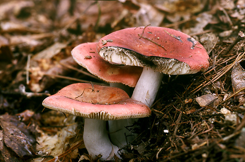 [特 徴] 傘は初めまんじゅう形で後には平らに開く。色は初め赤から褐色がかった赤色で後には色あせる。表面は湿っている時にやや粘性がある。 ひだは初め白色で後には淡黄色がかる。並び方は密で柄に離生する。柄は白色。傘の縁部、ひだ、柄ともに手でさわったり傷つけたりすると初め赤変し、 後には黒色に変色する。 |