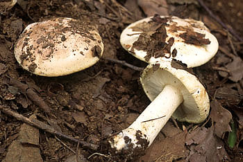 [特 徴] 傘は初め半球形で後にはまんじゅう形となり、最後にはほとんど平らに開く。色は中央部は黒褐色から淡赤褐色をおびるが、他の部分は白色からクリーム色。 表面には多少ぬめりがある。ひだは初め白色で後には褐色のシミがでる。並び方は密で柄に湾生する。柄は白または淡褐色で太く短い場合が多い。 柄の根もとはややふくらみ、肉は固くしまる。 |