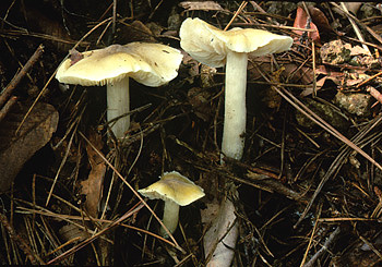 [特 徴] 傘は初め円錐形でのちには平らに開く。ただし中央部だけは突き出ている。地色は淡黄色で表面は暗緑褐色の繊維におおわれている。 ひだは初め白色で後にはやや黄色味をおびる。並び方は密から疎まで変化に豊み、柄に湾生する。柄は白色から淡黄色。 |