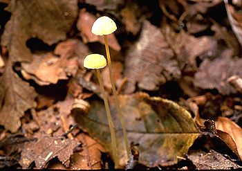 [特 徴] 傘は初め半球形から鐘形で後には開いてまんじゅう形になる。表面の色は淡黄色から黄色で傘の周辺部には放射状の溝線がある。ひだは柄に直生からやや垂生し、 並び方はややあらく、色は淡黄土色。柄は細くて長く、傘とほぼ同色で根もとは長くのび、柔らかい毛状の菌糸束をつけている。 |