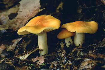 [特 徴] 傘は初めまんじゅう形で後にはほぼ平らに開き、表面の色はややくすんだ橙黄色。ひだは柄に垂生し、並び方はあらく、互いにしわ状の脈でつながっている。 色は、傘よりも淡い橙黄色。柄は傘よりも淡い橙黄色から白色。 |