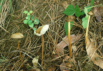 [特 徴] 傘は初めまんじゅう形で後にはほとんど平らに開く。表面の色は茶褐色から淡灰褐色で放射状のしわがある。ひだは白色で並び方はあらく、柄に離生する。 柄は暗褐色から橙黄褐色で根もとは根状となり、地中に深くはいる。 |