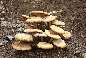 [特 徴] 傘は初めまんじゅう形で後には平らに開く。色は黄褐色や蜂蜜色で傘の中央部には細かいささくれがあり、周辺部には放射状の条線もみられる。 ひだは淡褐色から黄褐色で並び方は、やや密から疎。柄に直生またはやや垂生する。柄は傘とほぼ同色でつばはない。ナラタケと同様に黒色針金状の菌糸束を根もとにつけることが多い。 |