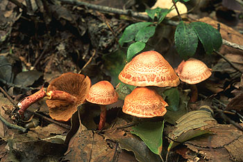 [特 徴] 傘は初めまんじゅう形で後にはほぼ平らに開く。表面は赤褐色のうろこ状のささくれでおおわれる。ひだは初めごく淡い褐色で後には褐色となり、並び方は密。 柄に直生からやや湾生する。柄は傘と同色のささくれがある。きのこを傷つけると、肉は黄色から赤色にゆっくりと変色する。 |