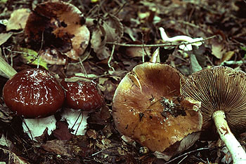 [特 徴] 傘は初めまんじゅう形で後にはほぼ平らに開く。色は初め紫褐色からあずき色、後には灰褐色となり縁部にはシワ状の溝線がある。 このシワは傘が開くにつれて目立たなくなる。ひだは初め白色から淡褐色で後には灰褐色から褐色となる。並び方は密で柄に直生から上生する。 柄は初め白色で後には淡褐色をおびる。根もとは大きくふくらみ、若いうちは、きのこ全体がちょうどダルマのように見える。つばはクモの巣状で初めは白色、 後には胞子が落下して茶褐色となる。 |
