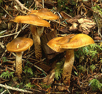 [特 徴] 傘は初め平たい円錐形からまんじゅう形で後にはほぼ平らに開く。色は帯黄褐色からややくすんだ茶褐色で、表面は著しいぬめりがある。 ひだは初め淡紫色から淡紫褐色で後には黄褐色から茶褐色。並び方は密で柄に上生から湾生する。柄は初め白色から淡褐色で後には不完全なリング状に裂けて褐色の地肌をあらわす。 柄の上部にはクモの巣状のつばをもつ。つばの上には胞子が落下して、成熟したきのこでは茶褐色となる。 |