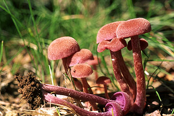 [特 徴] 傘は初めまんじゅう形で後にはほぼ平らに開く。表面の色は初め紫色だが、きのこが乾燥すると淡褐色になり、小さな鱗片状のささくれもでてくる。 ひだは濃紫色でウラムラサキ(裏紫)の名のとおり。並び方は疎で柄に直生から垂生する。柄は紫色で表面は繊維状。 |