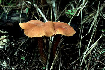[特 徴] 傘は初めまんじゅう形で後には平らに開く。表面には細かいささくれがあり、色は赤褐色から黄褐色。ひだは柄に直生からやや垂生気味で並び方はややあらい。 柄は傘とほぼ同色で繊維状の模様があり、根もとは紫褐色の菌糸でおおわれる。 |