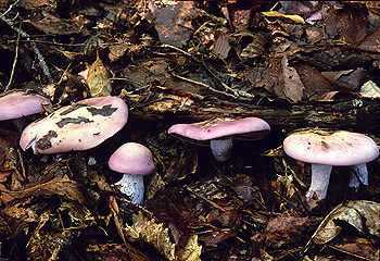 [特 徴] 傘は初めまんじゅう形で後には平らに開く。色は初め美しい紫色だが、傘が開くにつれて色があせ、灰白色や淡褐色になる。ひだは初め美しい紫色で後には色あせて灰白色になる。 並び方は密で柄に湾生する。柄は傘とほぼ同色かやや淡色で表面は繊維状。根もとはふくらむ場合が多い。 |