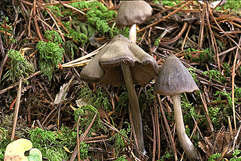 | [特 徴] 傘は初め円錐形で後には中央部が盛り上がった平らに開く。表面の色は暗灰褐色で湿っている時は放射状のすじがある。ひだは初め灰白色で後には肉色となり、 並び方はやや密で、柄に離生する。柄は淡灰褐色でねじれ、根もとは白色綿状の菌糸におおわれている。 |