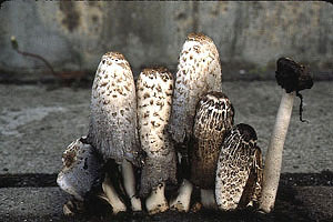 | [特 徴] 傘は初め長卵形から円柱状で後には鐘形に開く。色は、初め白色で後には淡褐色となる。表面は淡褐色のささくれ状の鱗片をつけ、周辺部には状線もみられる。 ひだの並び方は密で、柄に離生する。初めは白色で胞子の成熟に従って黒色になり、傘の周辺部から液化してしたたりおちる。柄はほぼ白色で上下に動かせるつばを持つ。 柄の表面にも白色の糸くず状の鱗片をつける。 |