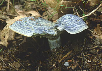 | [特 徴] 傘は初め中央部分がへこんだまんじゅう形で、後には開いてほとんど平らになる。表面の色は藍青色で年輪状の模様がある。ひだは柄に直生からやや垂生し、 並び方はやや密で傘とほぼ同色。傷つけると緑色に変色する。柄は傘とほぼ同色できのこが生長すると中空になる。 |